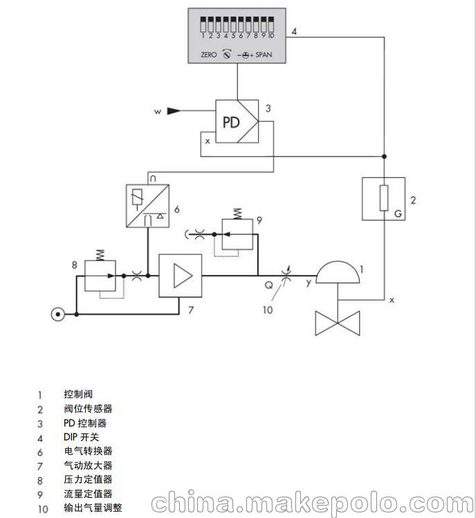 3730-0 型電氣閥門定位器作為氣動控制 閥的重要附屬裝置,裝配到氣動控制閥并 用于按輸入控制信號將閥位準(zhǔn)確定位。由 控制系統(tǒng)或控制器來的直流輸入控制信 號作為給定值 w, 閥位作為被調(diào)參數(shù)和反 饋量 x,閥門定位器將兩者進(jìn)行比較,進(jìn)而 按一定規(guī)律輸出信號 y 給氣動執(zhí)行器調(diào)節(jié) 閥位。 要求的供氣壓力在 1.4 到 6 巴之間。作為 參考變量的電流輸入信號應(yīng)在 4 到 20mA。 定位器可以直接裝配在 3277 型執(zhí)行器 上,或符合 IEC60534-6(NAMUR)標(biāo)準(zhǔn) 裝配到相應(yīng)的執(zhí)行器上。每種方式都有相 應(yīng)的安裝件。 3730-0 型定位器主要由閥位傳感器(閥 位—電阻線性轉(zhuǎn)換)、模擬量電氣轉(zhuǎn)換器 和氣動放大器以及模擬控制器等部件組成。